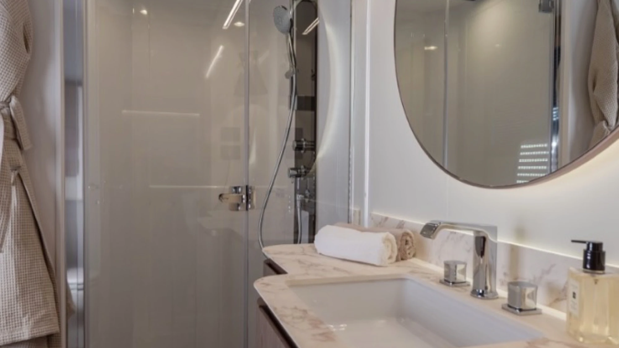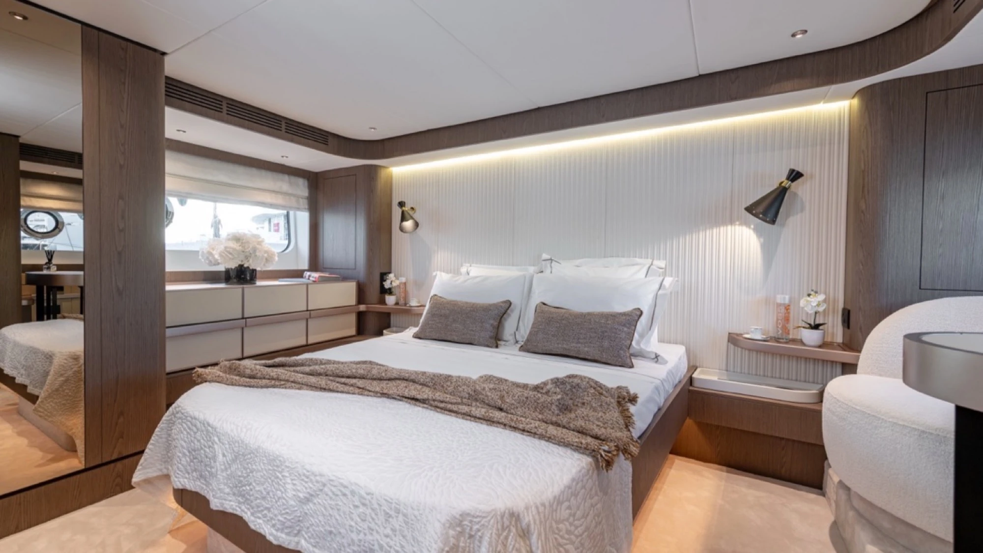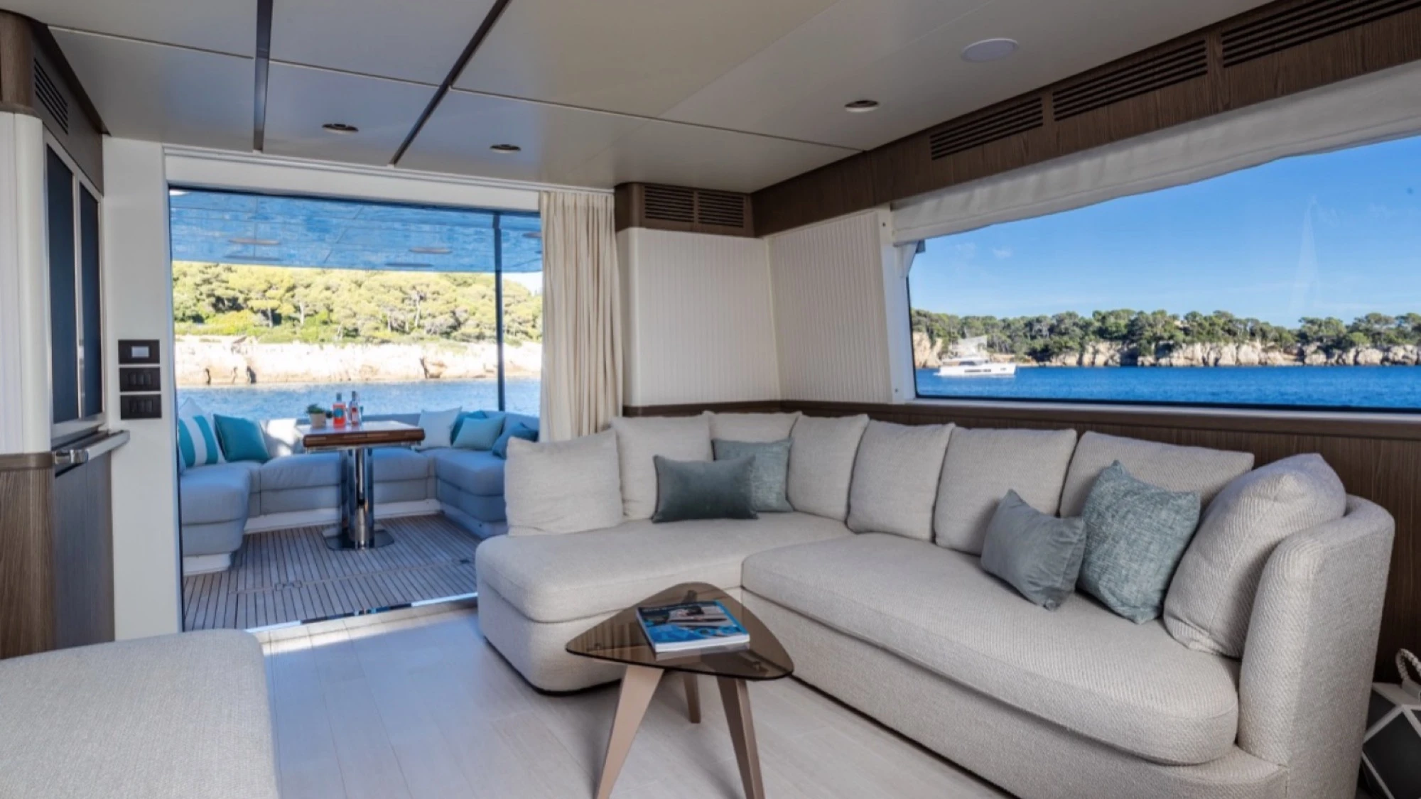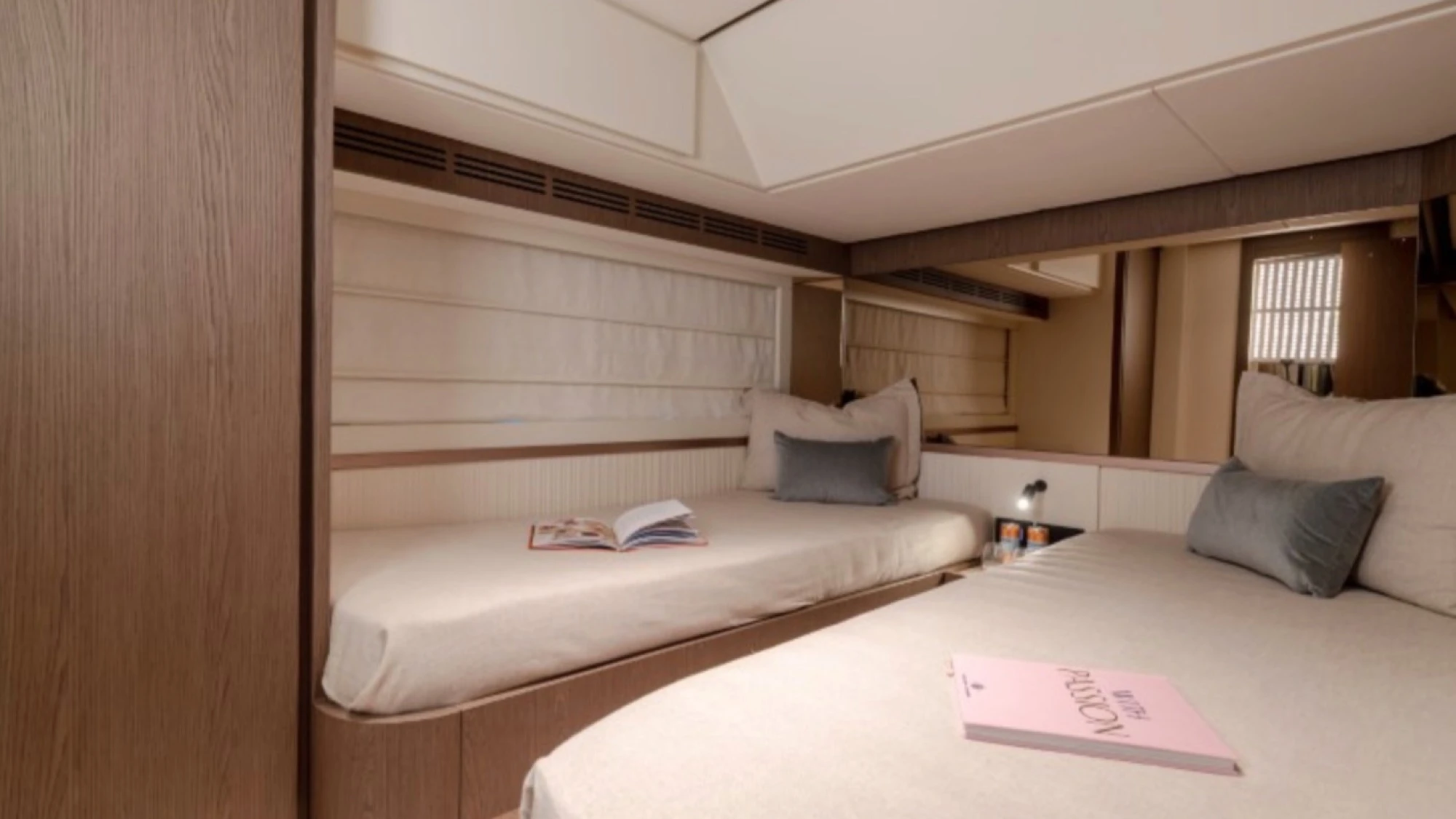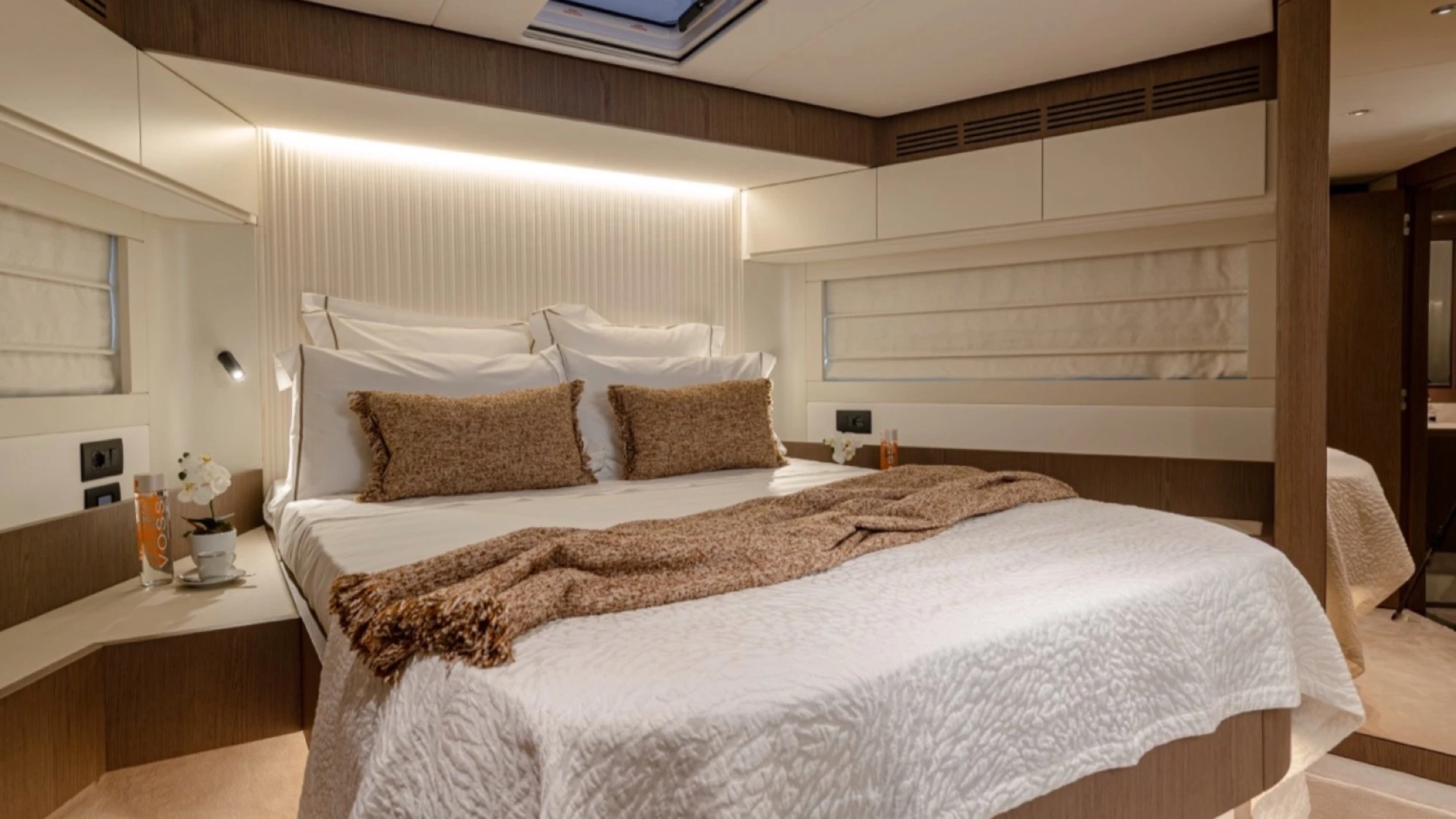 Interior & Comfort: High-quality materials and finishes create a refined atmosphere. The yacht offers 4 cabins with 3 heads, plus a crew cabin for 2 people. The 4th cabin is configured with 2 beds in laminate smart Oak wood.