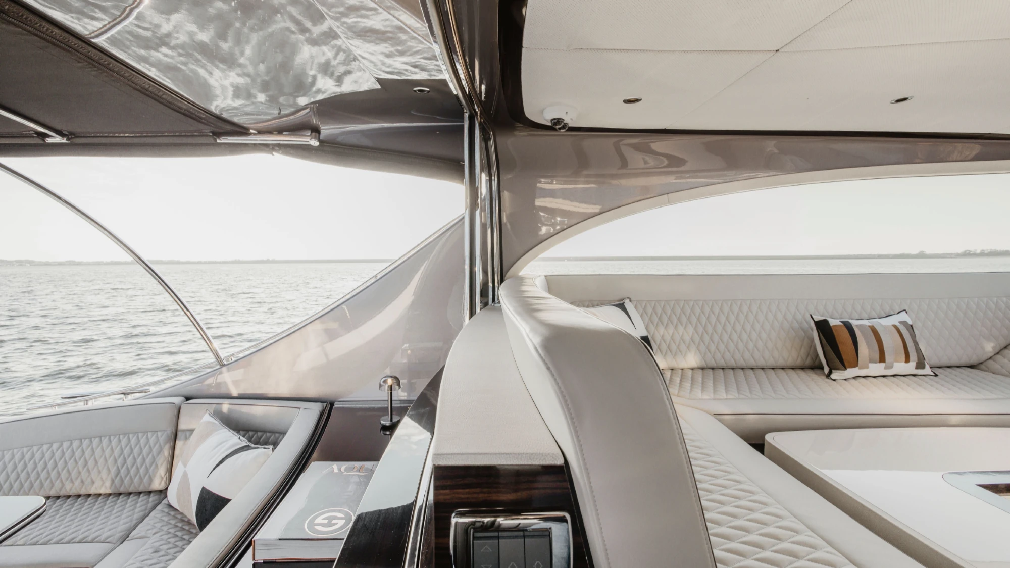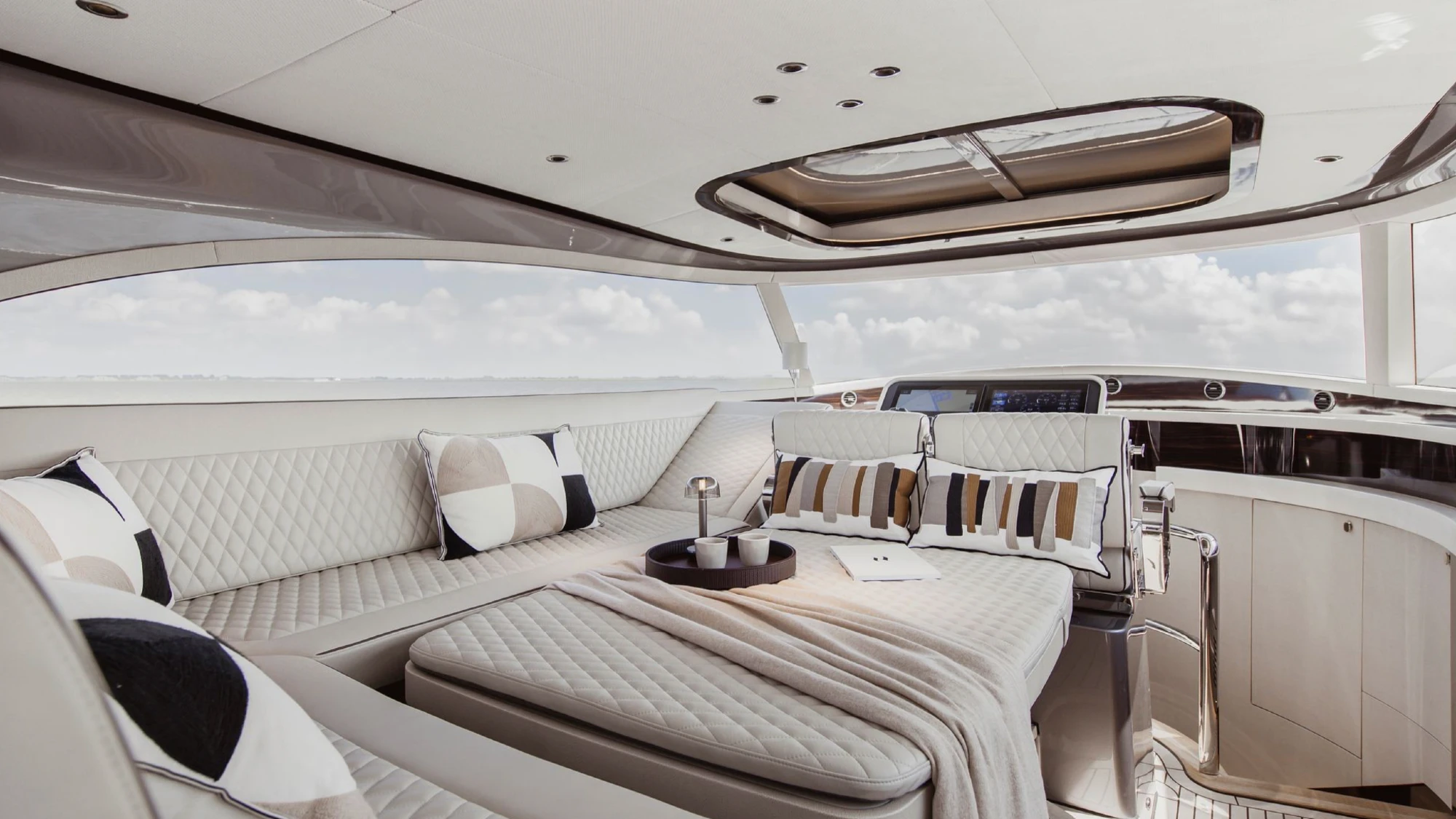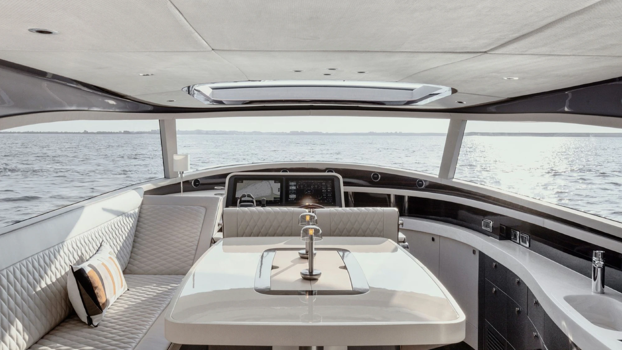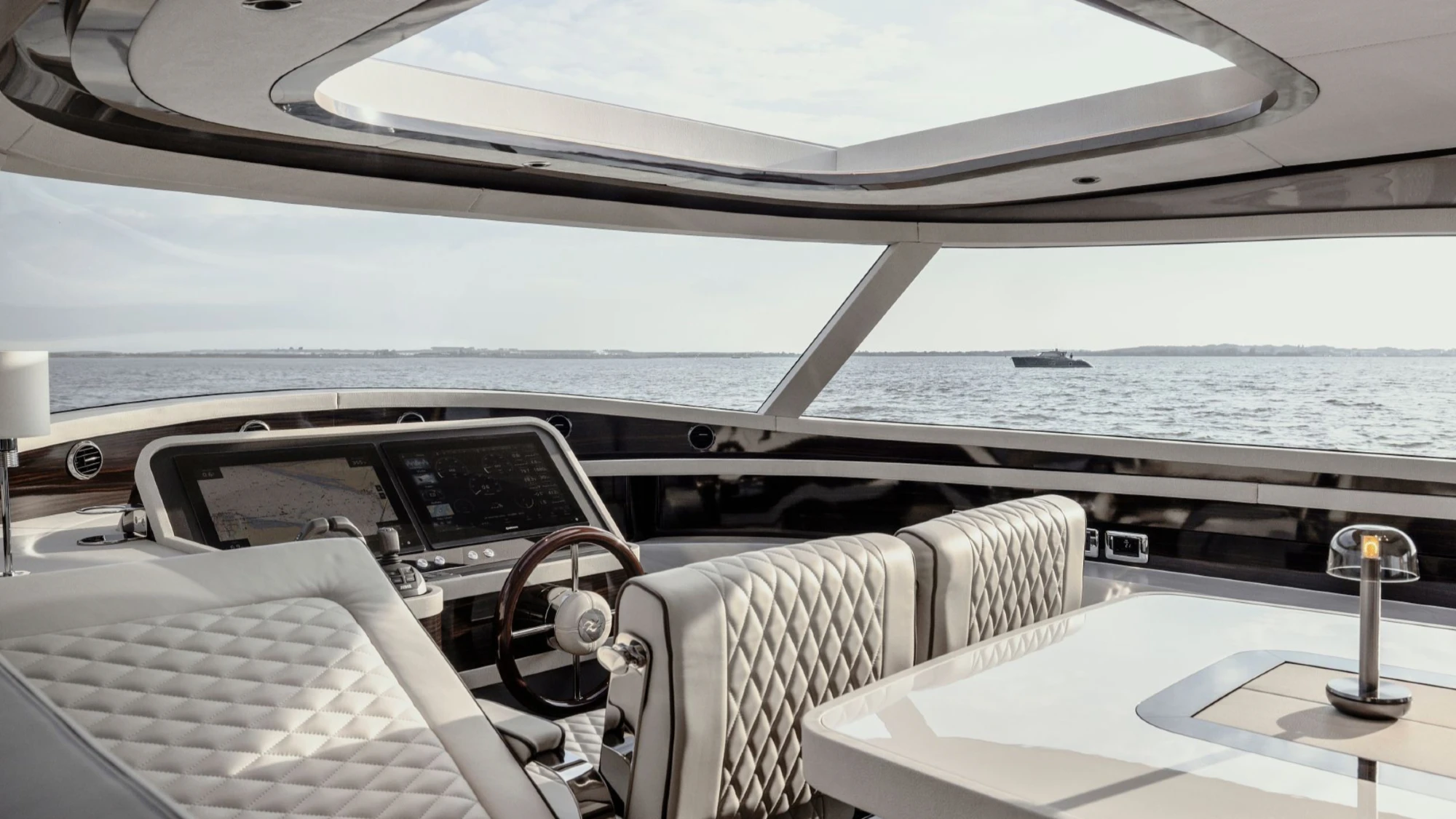 Ikoniczna sylwetka — płynne, muskularne linie, rzeźbiona rufa typu “reverse transom” oraz duża platforma kąpielowa — od razu wyróżnia ten model na wodzie. Panoramiczna szyba, głęboki kokpit z wygodnymi siedziskami oraz przestronna strefa wypoczynkowa na dziobie tworzą luksusową, otwartą przestrzeń do spotkań, posiłków lub relaksu na morzu. Widoczność 360° z pozycji sternika zapewnia pełną kontrolę i bezpieczeństwo, nawet gdy właściciel prowadzi łódź samodzielnie.