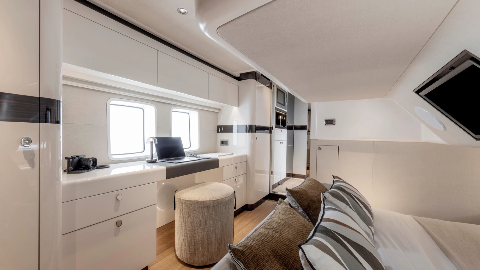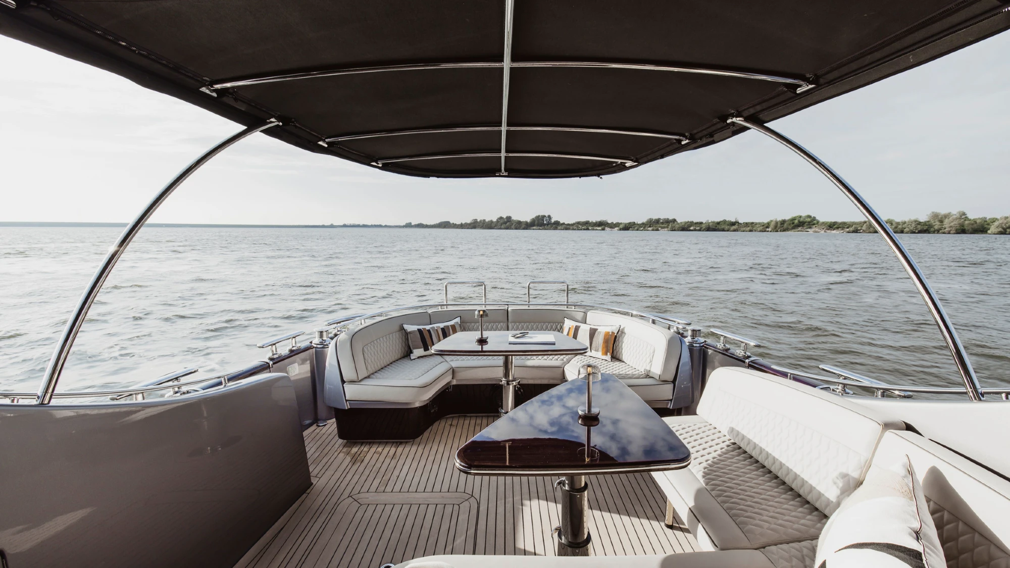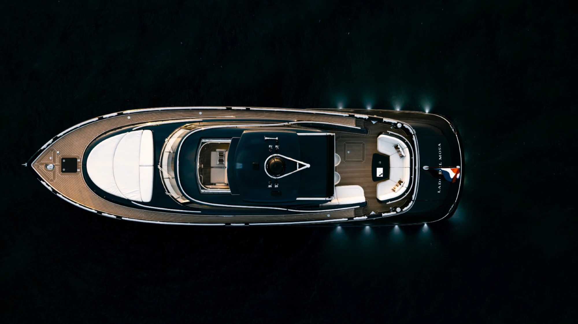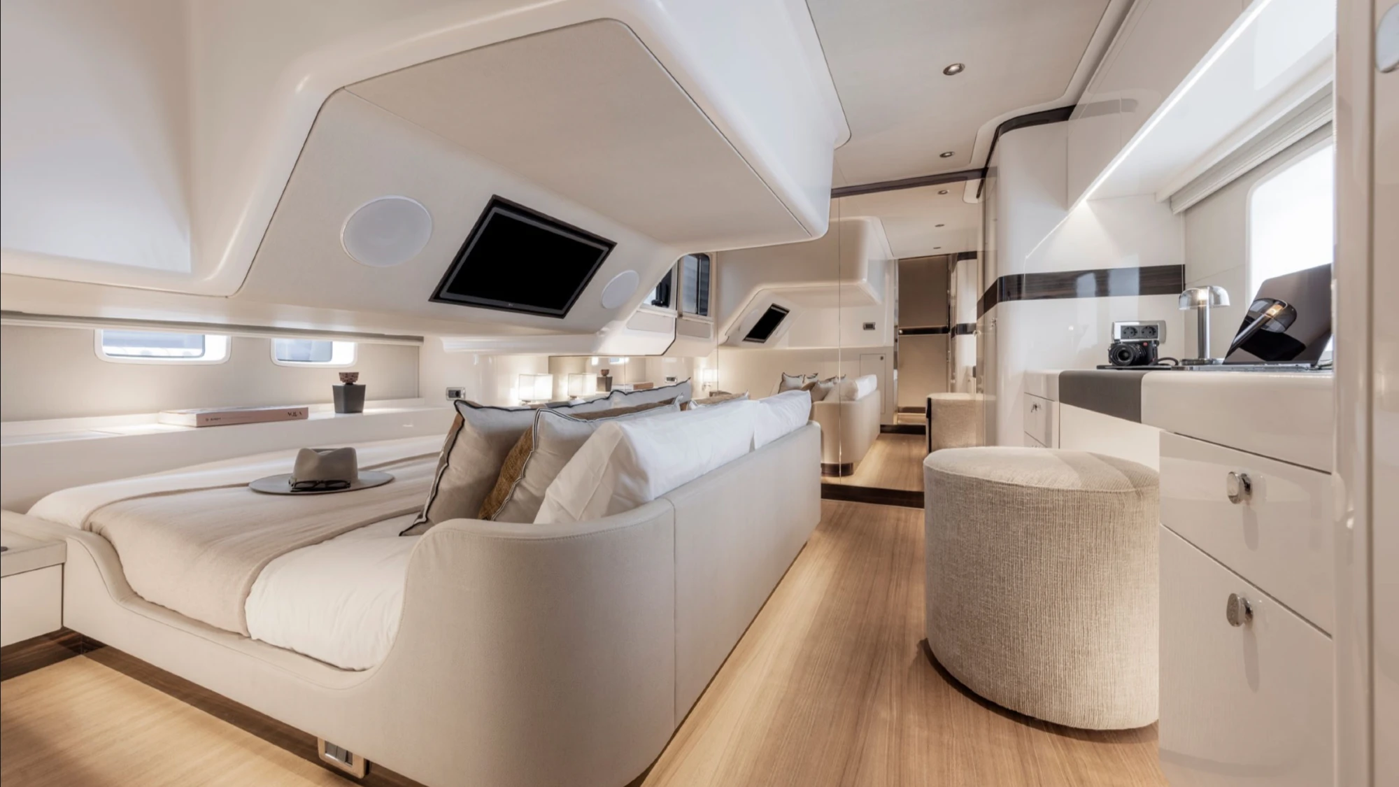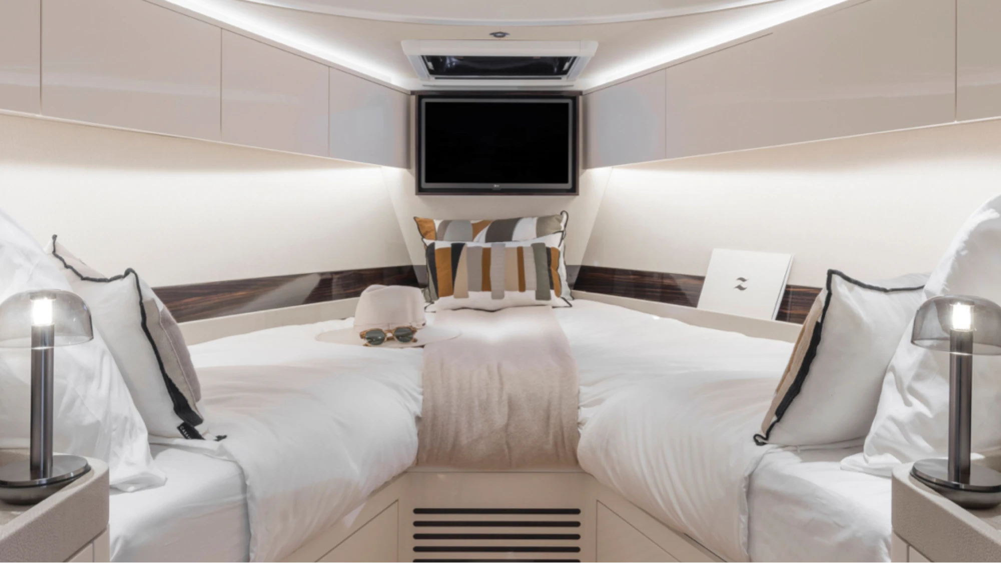 Ikoniczna sylwetka — płynne, muskularne linie, rzeźbiona rufa typu “reverse transom” oraz duża platforma kąpielowa — od razu wyróżnia ten model na wodzie. Panoramiczna szyba, głęboki kokpit z wygodnymi siedziskami oraz przestronna strefa wypoczynkowa na dziobie tworzą luksusową, otwartą przestrzeń do spotkań, posiłków lub relaksu na morzu. Widoczność 360° z pozycji sternika zapewnia pełną kontrolę i bezpieczeństwo, nawet gdy właściciel prowadzi łódź samodzielnie.