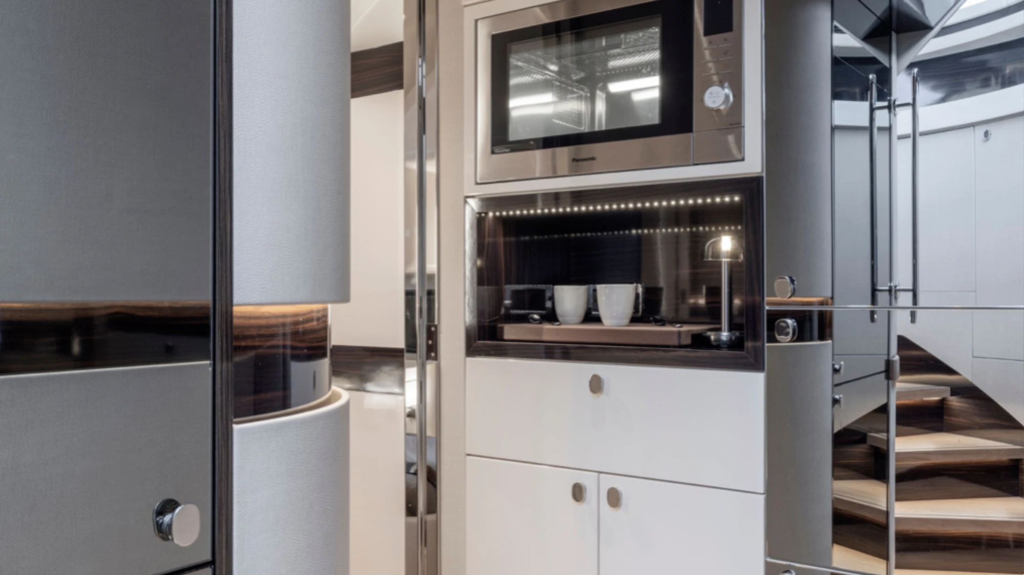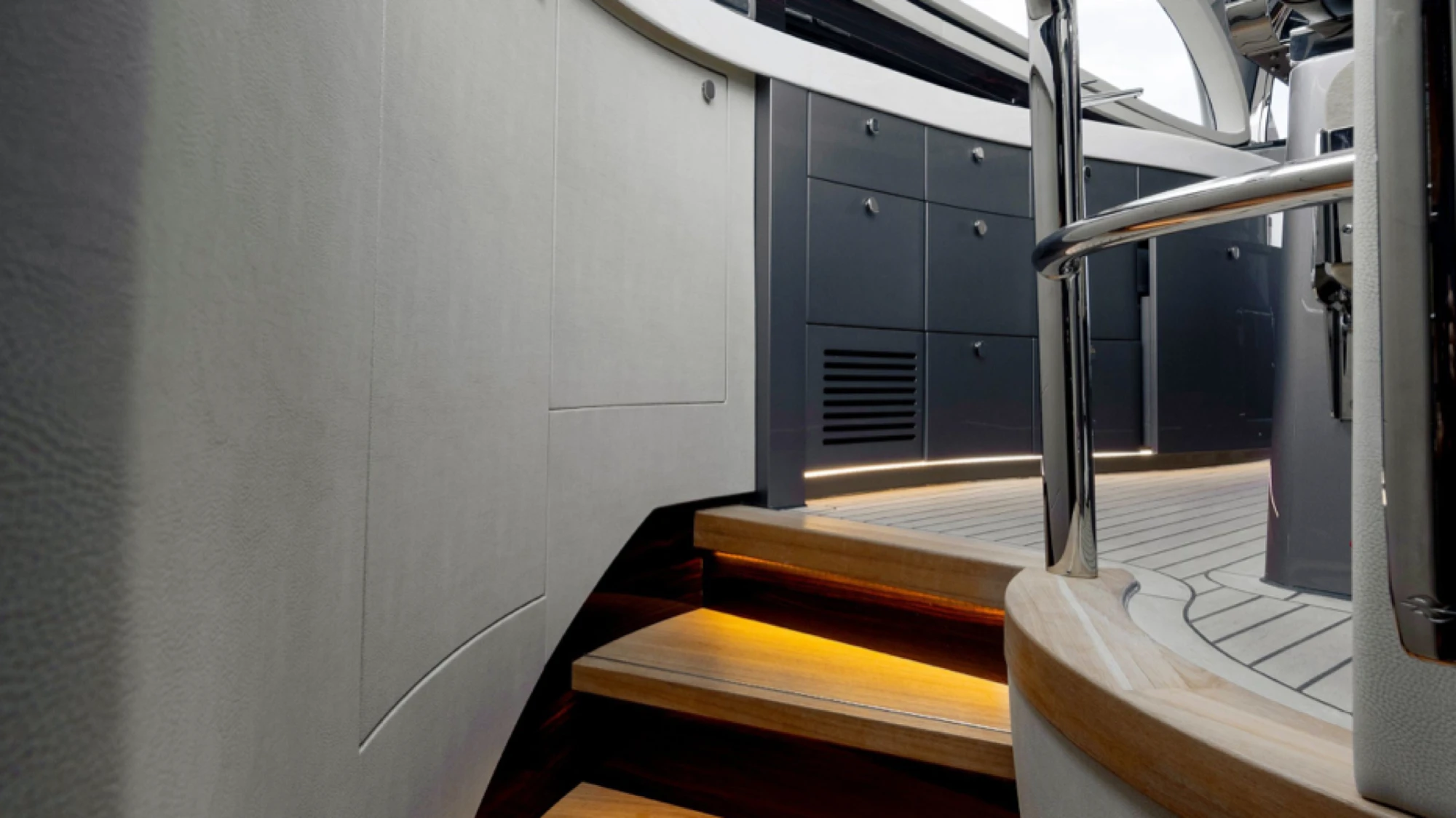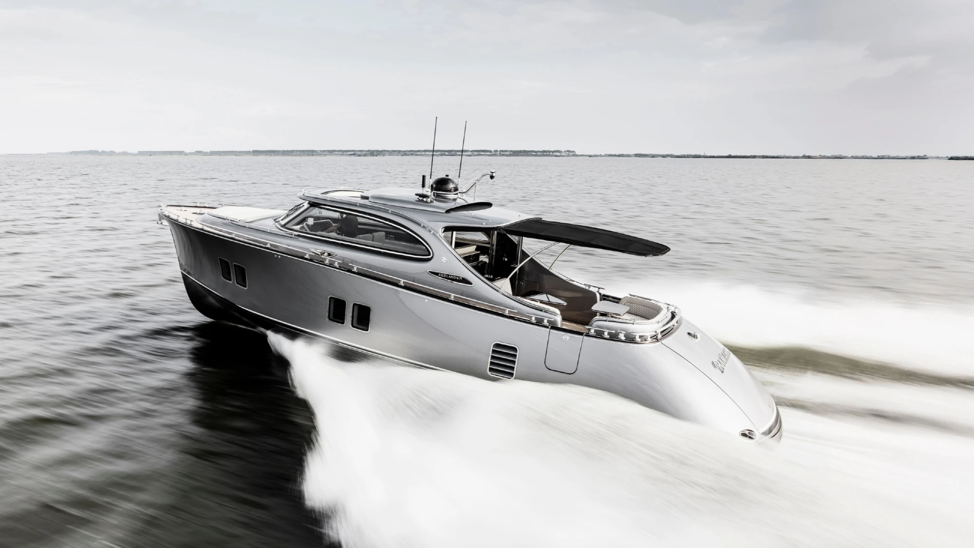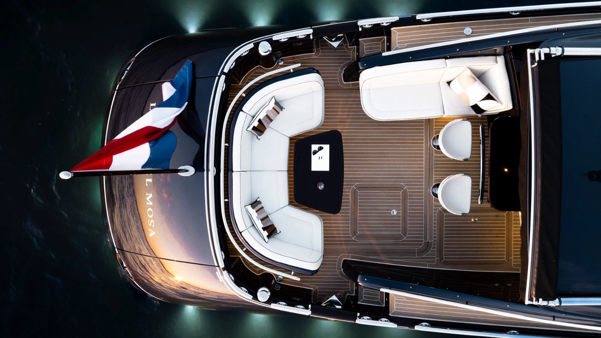 Ikoniczna sylwetka — płynne, muskularne linie, rzeźbiona rufa typu “reverse transom” oraz duża platforma kąpielowa — od razu wyróżnia ten model na wodzie. Panoramiczna szyba, głęboki kokpit z wygodnymi siedziskami oraz przestronna strefa wypoczynkowa na dziobie tworzą luksusową, otwartą przestrzeń do spotkań, posiłków lub relaksu na morzu. Widoczność 360° z pozycji sternika zapewnia pełną kontrolę i bezpieczeństwo, nawet gdy właściciel prowadzi łódź samodzielnie.